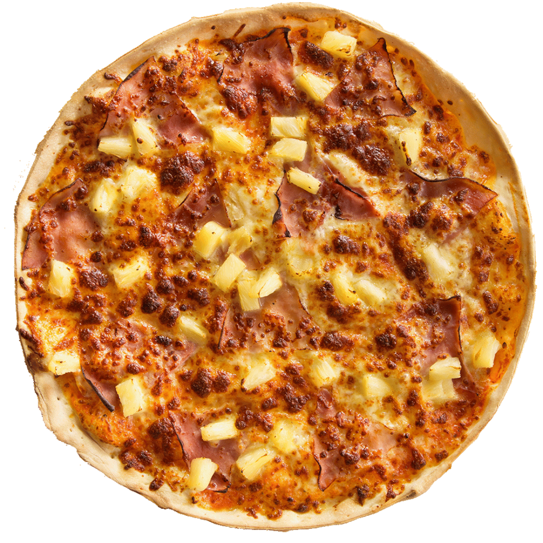 A tropical favorite with ham, pineapple, and melted cheese on a classic tomato base.