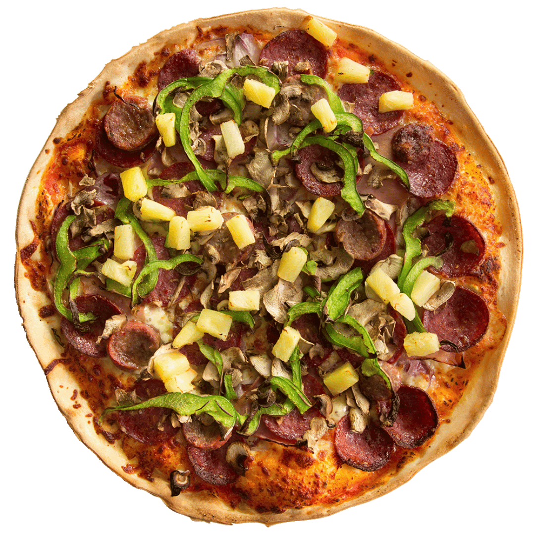 A loaded favourite: mushroom, capsicum, onion, pepperoni, ham, lamb sausage & pineapple.